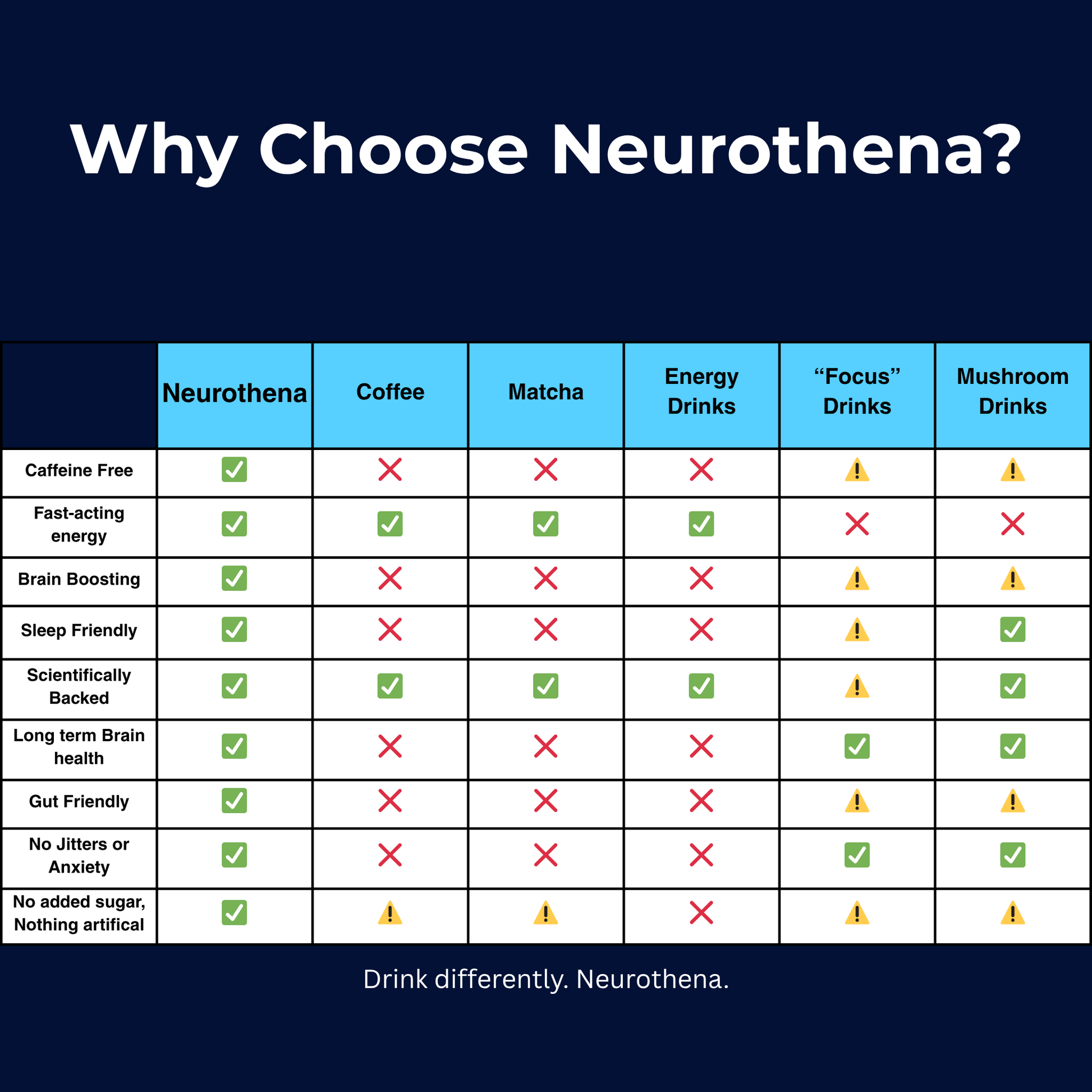 Unlike caffeine which blocks the sleep signal in the brain and speeds up the heart rate, Neurothena actually boosts energy and motivation, without increasing heart rate, and is actually gentle and kind to t your gut, mind and body.