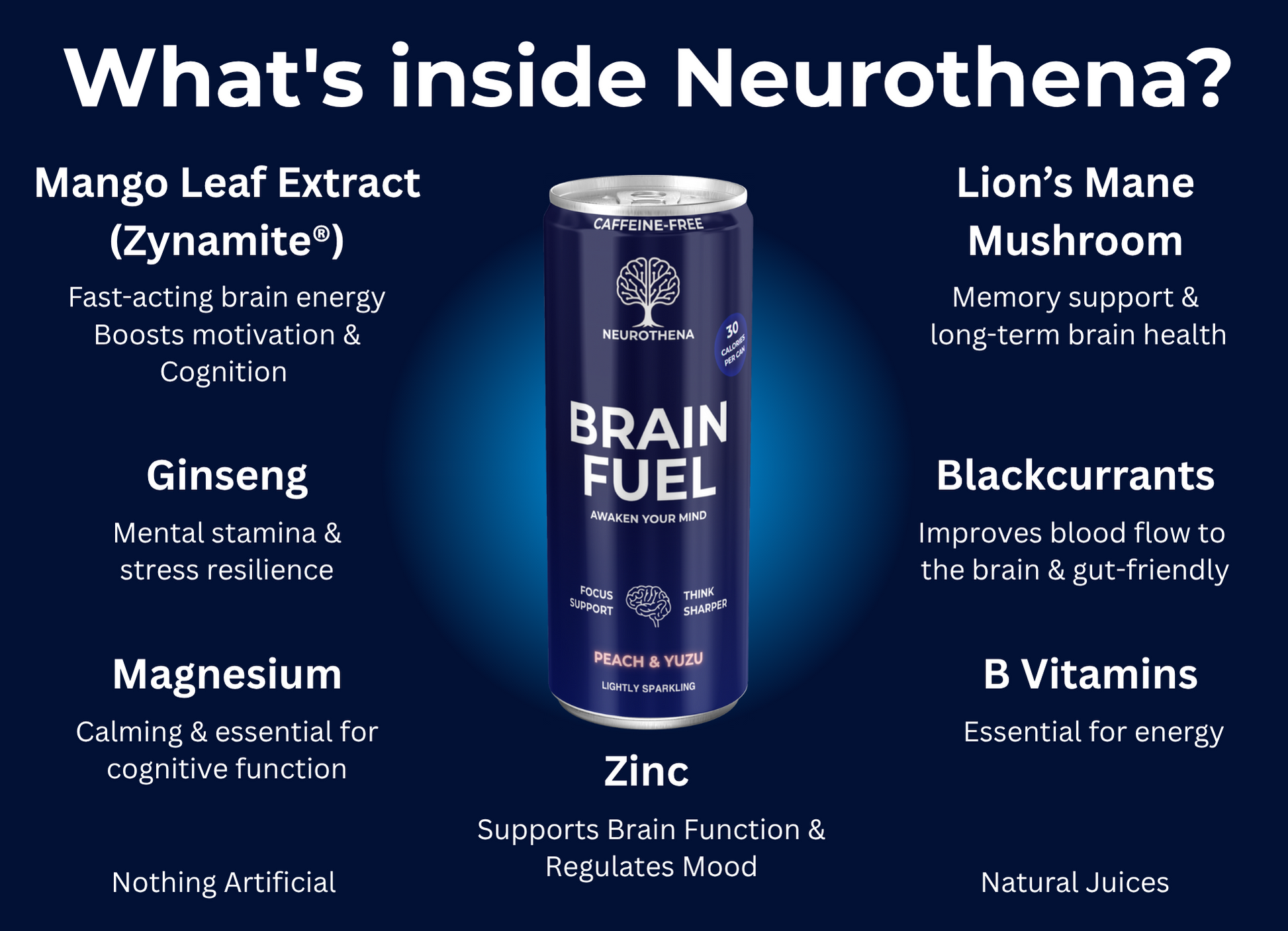 Neurothena is a caffeine-free productivity drink designed to fuel your brain without the crashes, jitters, anxiety, or stomach issues of coffee, matcha and energy drinks. Formulated by a molecular biologist, it’s powered by ingredients like Mango Leaf extract (Zynamite®), Lion’s Mane, magnesium and Blackcurrant Extract to sharpen your mind, give you fast, clean energy without the downsides of caffeine, and support long-term brain health.