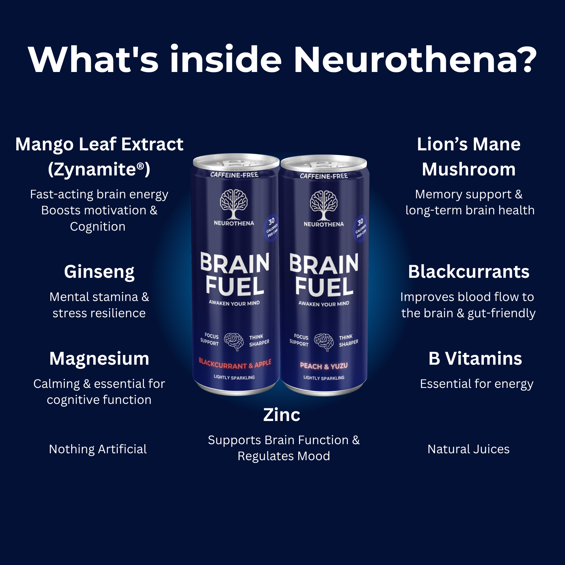 Neurothena is a caffeine-free productivity drink designed to fuel your brain without the crashes, jitters, anxiety, or stomach issues of coffee, matcha and energy drinks. Formulated by a molecular biologist, it’s powered by ingredients like Mango Leaf extract (Zynamite®), Lion’s Mane, magnesium and Blackcurrant Extract to sharpen your mind, give you fast, clean energy without the downsides of caffeine, and support long-term brain health.